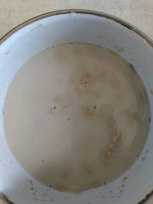 - Roer in een aparte kom, tot een gladde massa, de benodigde hoeveelheid starter met 100 ml warm water en voeg de resulterende vloeistof toe aan de pot aan de mout.
