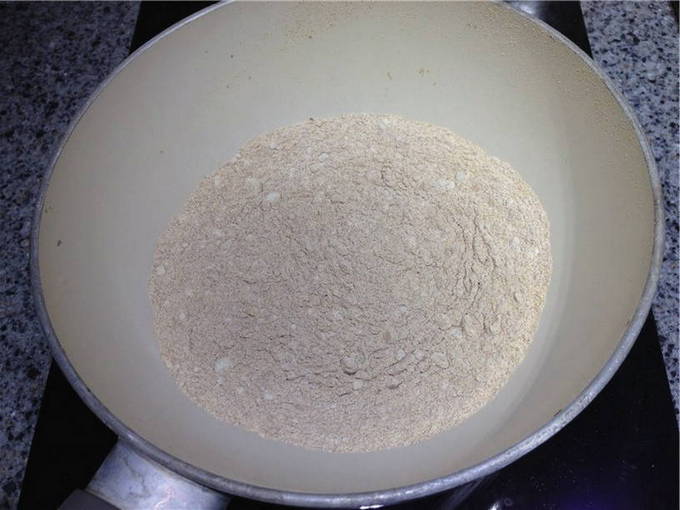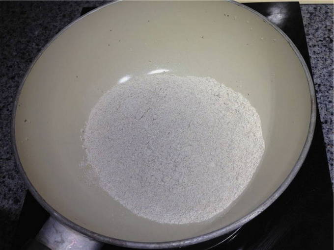 - Giet 100 gram bloem in een dikwandige koekenpan of wok en zet op middelhoog vuur.