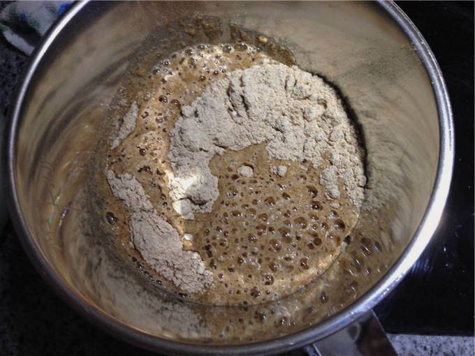 - Meng in een diepe kom bloem en gemalen mout. Giet het mengsel met 1 liter warm gekookt water en meng grondig met een garde, breek de klontjes. Om het roeren gemakkelijker te maken, wordt aanbevolen om water in delen te gieten.Giet het resulterende wort in een hittebestendige container, bij voorkeur met een deksel. Verwarm de oven voor op 100-120 ̊С en verwijder de container daar gedurende 5-6 uur.