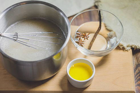 - Nadat de aangegeven tijd is verstreken, bereidt u alle andere ingrediënten voor en verwijdert u de startercultuur. Kook in een kleine pan 500 ml water samen met de steranijs en vanille. Voeg honing toe aan kokend water, zet het vuur uit en laat het mengsel een beetje afkoelen. Giet de resulterende vloeistof met kruiden en zuurdesem in een pot van drie liter. Voeg water toe tot bijna aan de bovenkant van de pot, meng de inhoud en laat nog een dag in warm en donker rijpen.