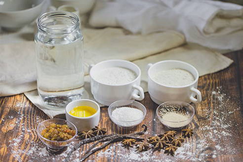 - Eerst moet je de startercultuur voorbereiden. Meng de bloem met warm water, roer tot een gladde massa, breek alle klontjes met een garde en voeg de gist toe. Roer alles nogmaals goed door elkaar en laat enkele uren op kamertemperatuur trekken.