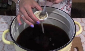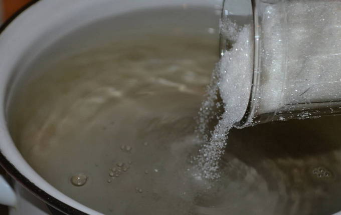 - Meng in een grote pan de suiker, cichorei en citroenzuur. We verdunnen het droge mengsel met koud water. We zetten het fornuis aan en zetten er een bak met vloeistof op. Breng het werkstuk op middelhoog vuur aan de kook. Haal de pan van de brander en zet het fornuis uit.