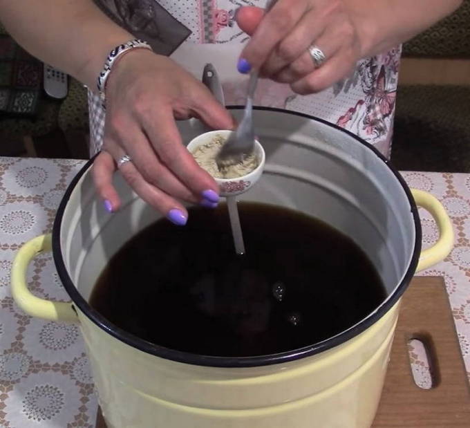 - Het is ten strengste verboden om gist in het hete mengsel te gieten. De vloeistof moet worden afgekoeld tot een bepaalde temperatuur (30-35 graden) - het mag niet koud zijn, maar warm. Nu kun je de gist erin gieten.