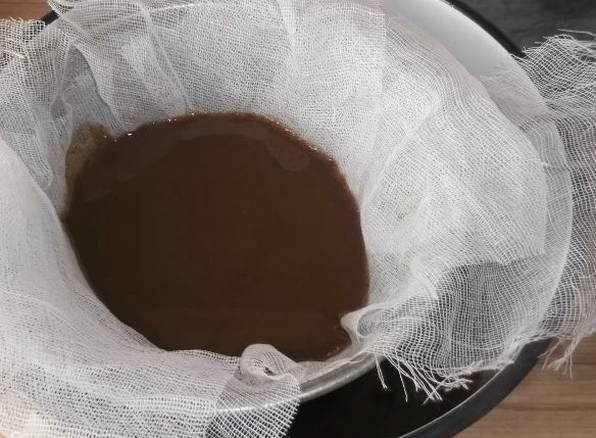 Filter het kwas na 24 uur door kaasdoek in een andere container. Een glazen pot is hiervoor het meest geschikt. We koelen het kwas en serveren het in glazen.
