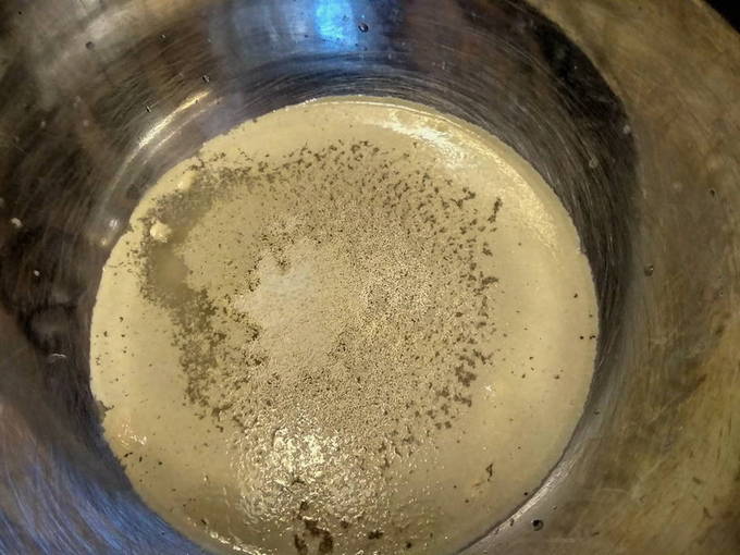 - Om kwas te maken, hebben we een pan nodig. We gieten er niet al het water in, maar slechts een halve liter. Giet droge gist in het water. Het water voor kwas moet heet zijn.