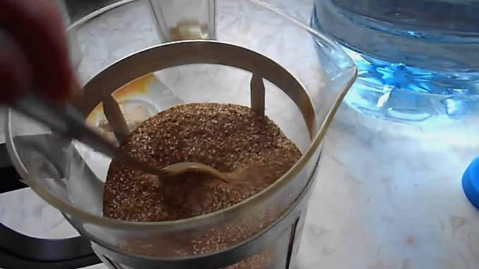 - Nu moet je het water koken om het droge mengsel te gieten. We zetten het fornuis aan en plaatsen een kleine container op de brander. Giet in water en breng aan de kook. Giet gekookt water (300 ml) in een glas met het mengsel. We wachten tot de suiker en cichorei zijn opgelost.