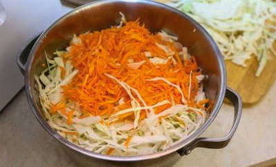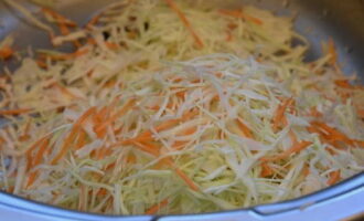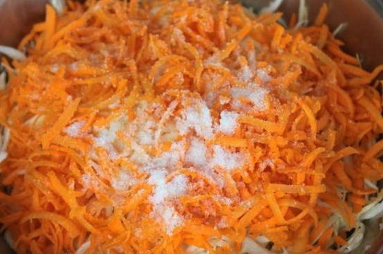 - Voeg grof geraspte wortelen toe aan de kool. Kneed de massa met je handen tot het sap vrijkomt.