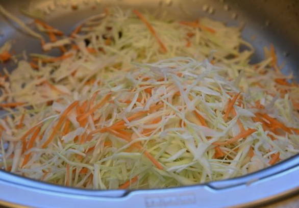 Snijd op dit moment de kool in dunne reepjes en haal de wortels door een rasp. Roer groenten door elkaar.