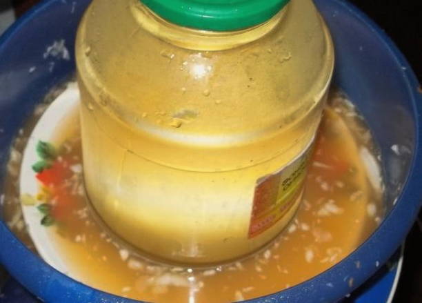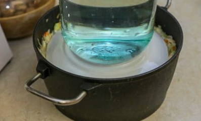 - We plaatsen het product in een pot van drie liter en laten het 5 dagen onbedekt staan. Elke dag maken we kleine gaatjes in het werkstuk. Dan sturen we het naar de koelkast.