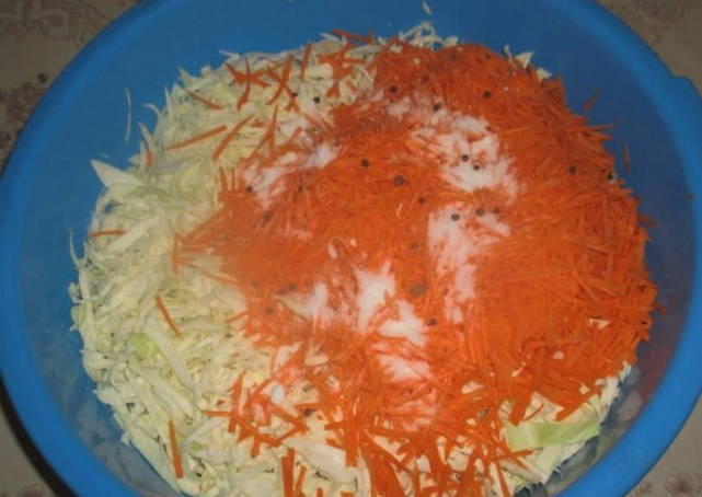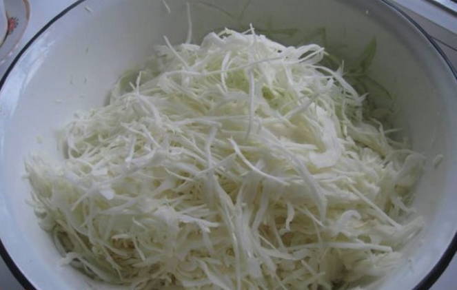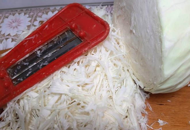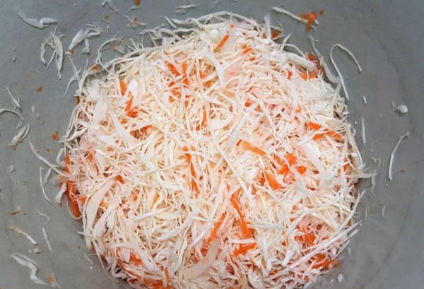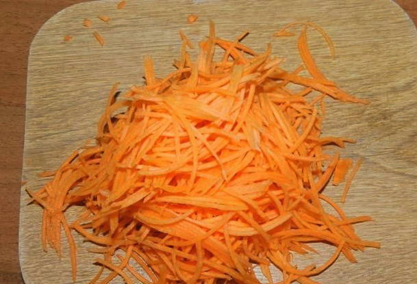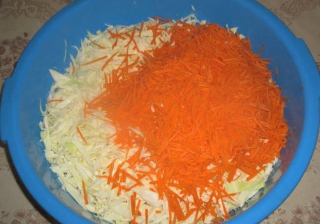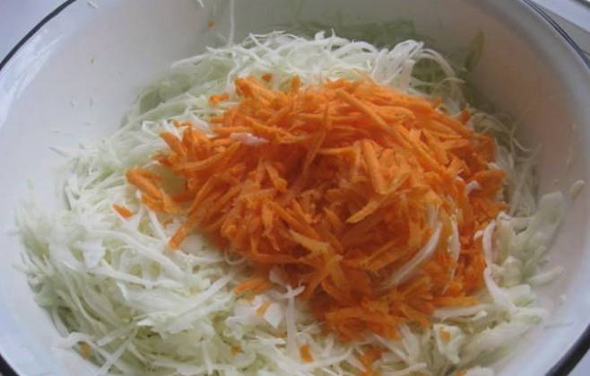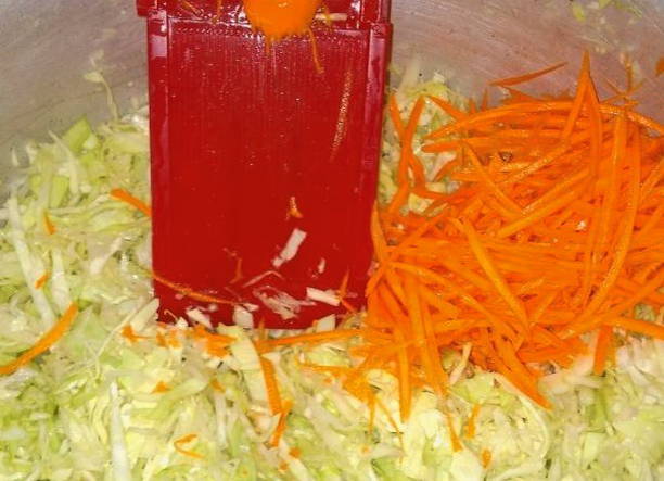 - We wassen de groenten. Snijd de kool in dunne reepjes en rasp de wortelen. We dompelen voedsel onder in een gemeenschappelijk gerecht.