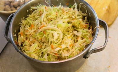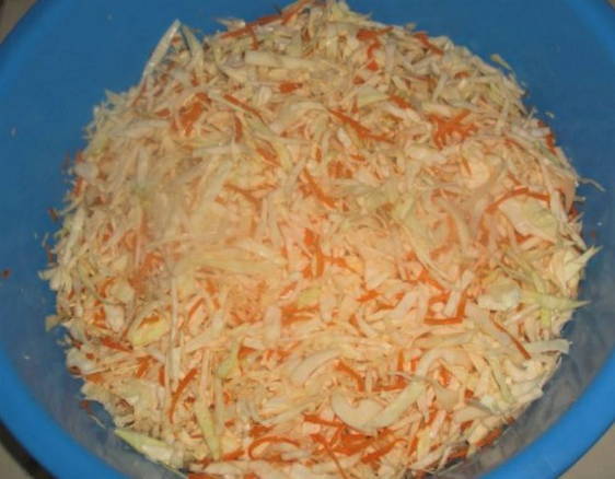 - We dompelen de koolrietjes in de emmer. We leggen hier ook geraspte wortelen. Roer het voedsel totdat het sap vrijkomt.