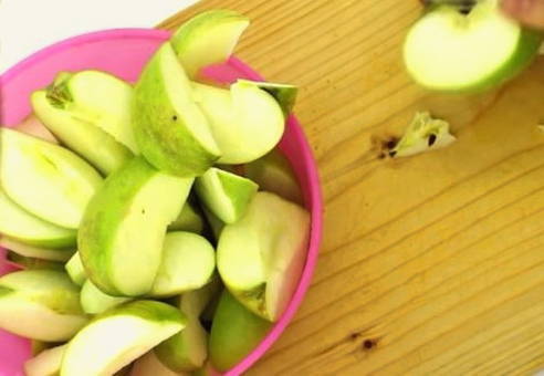 - Snijd de appels in kleine stukjes. Haal er voorzichtig de kern en de botten uit.