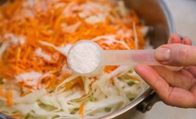 - Bestrooi de groentemassa met de benodigde hoeveelheid zout en suiker. Roer het voedsel goed door. We doen dit lange tijd en met kracht zodat de inhoud het sap eruit laat.