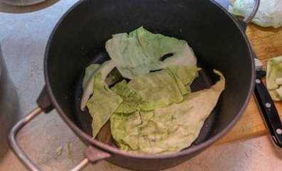- Leg de koolbladeren op de bodem van een ander gerecht. Voeg ook laurierblaadjes en zwarte peperkorrels toe.