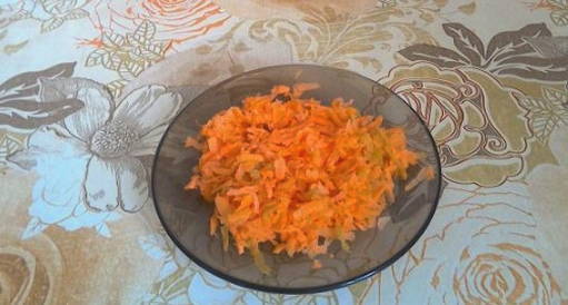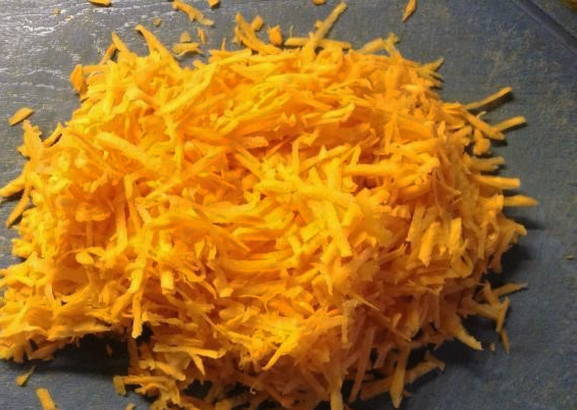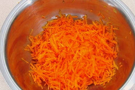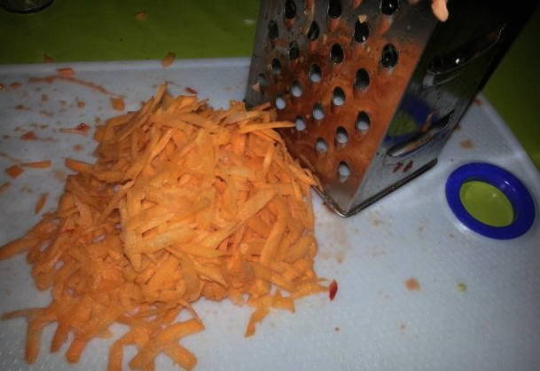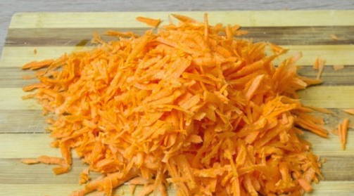 - De wortelen moeten ook in dunne reepjes worden gesneden. U kunt hiervoor een rasp gebruiken.