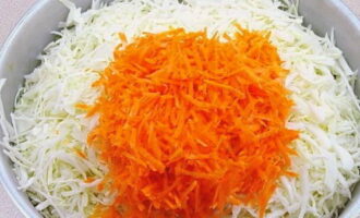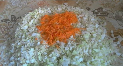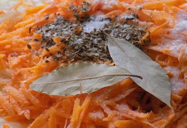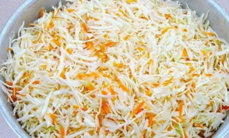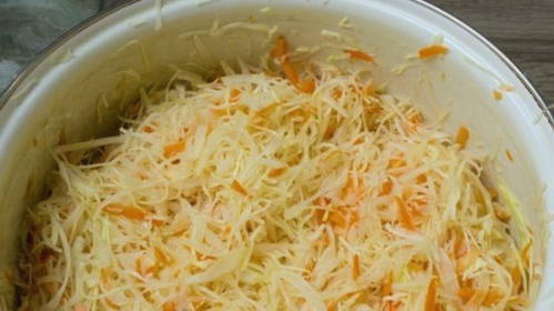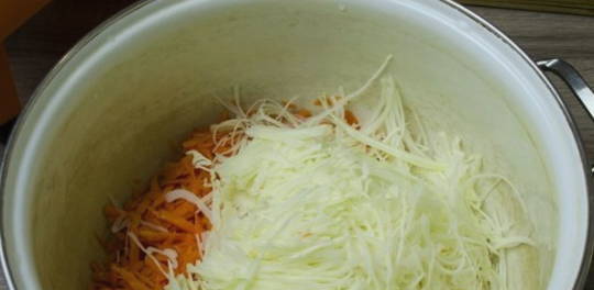 - Kneed met kracht de kool met wortelen tot het sap verschijnt. Roer het product vervolgens naar smaak met zout, suiker en kruiden. Je kunt zwarte peperkorrels of laurierblaadjes toevoegen.