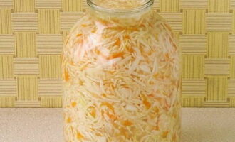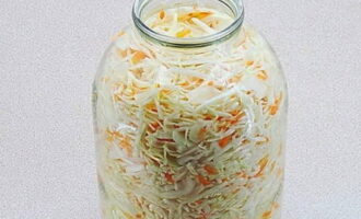 - Doe de geperste kool samen met het sap stevig in een pot van drie liter. Giet de inhoud van de afgekoelde marinade erbij en laat een dag op kamertemperatuur staan.