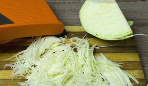 - Snijd de kool op een gemakkelijke manier in dunne lange reepjes. U kunt een mes of een speciale groentesnijder gebruiken.