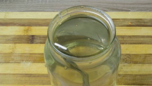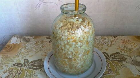 - Na een dag kan de inhoud worden doorboord met een spatel. Het binnendringen van lucht zal overtollige bitterheid verwijderen. Daarna sluiten we de plano af met een nylon deksel. Klaar, je kunt het opbergen.