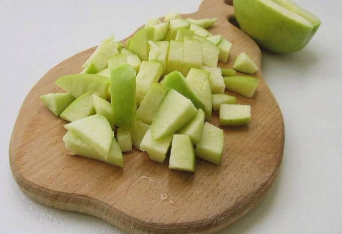 - Snijd de appels in kleine stukjes en doe ze samen met het groentemengsel in een pot van drie liter. Dit doe je in laagjes. We laten het werkstuk 3 dagen in de kamer en sluiten het dan af met een deksel.