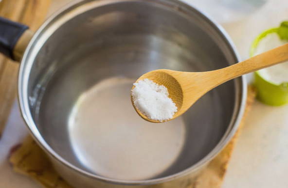 - We verwarmen het water in een pan of kookpan. Los de suiker en het zout erin op en laat de vloeistof afkoelen.