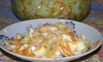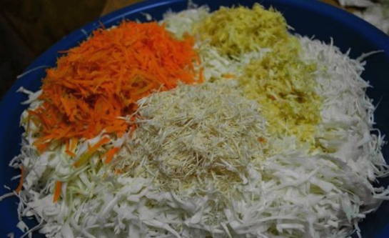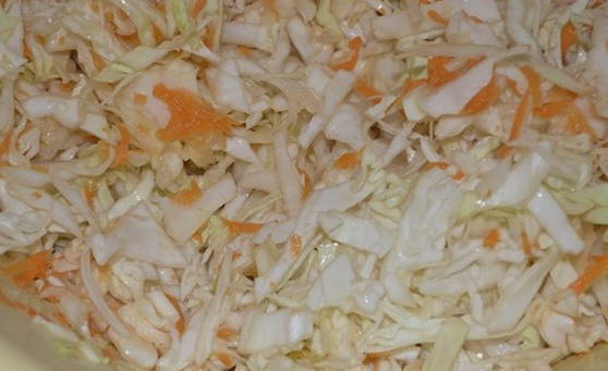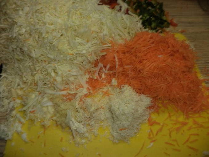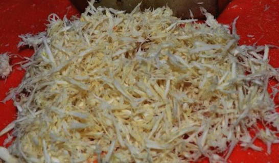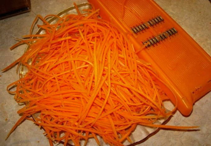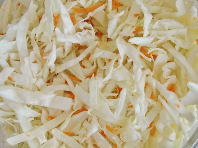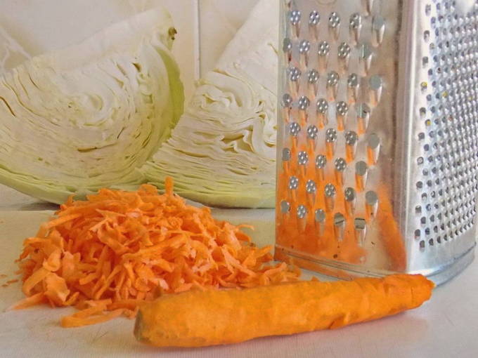 - De kool moet in dunne reepjes worden gesneden. Het is voldoende om de wortelen te raspen.