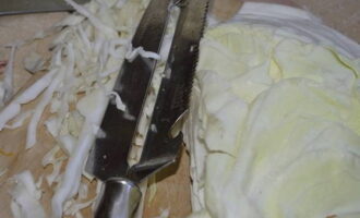Snijd de voorbereide kool in dunne reepjes.