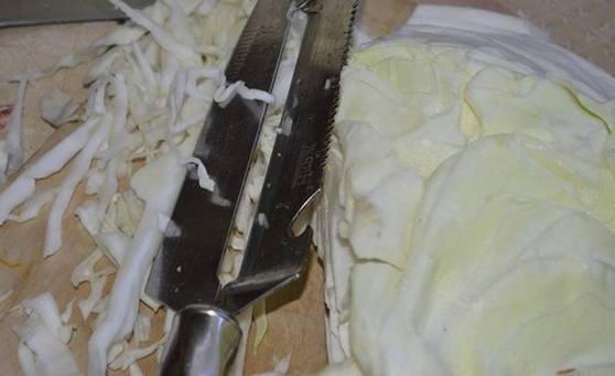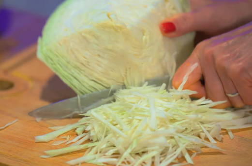 - Snijd de witte kool in kleine en lange reepjes.