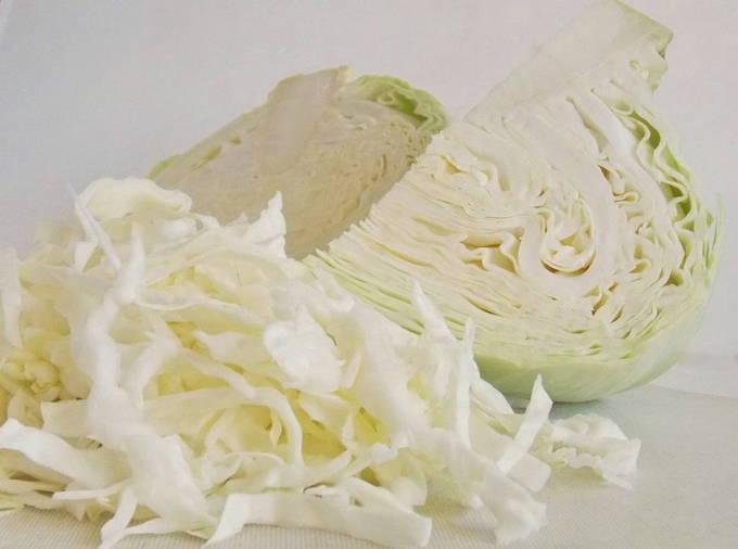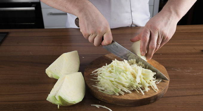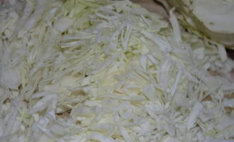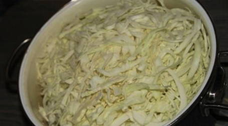 - We reinigen de witte kool van vuil en snijden hem vervolgens in lange reepjes. Doe het ingrediënt in een diepe pan.
