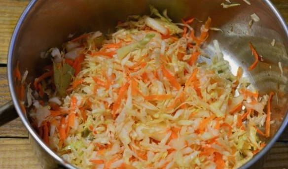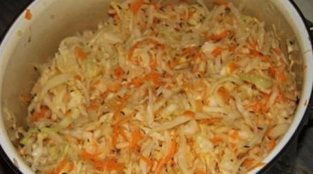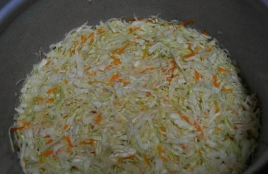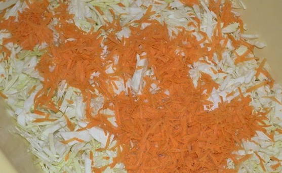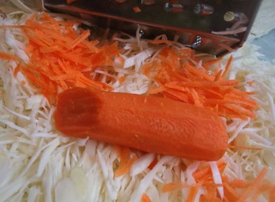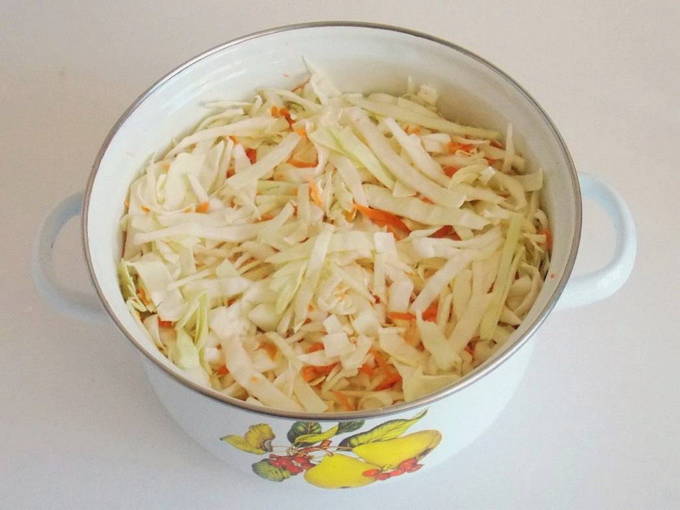 - Dompel de kool in een grote emaille pot. We vullen het aan met geraspte wortelen.