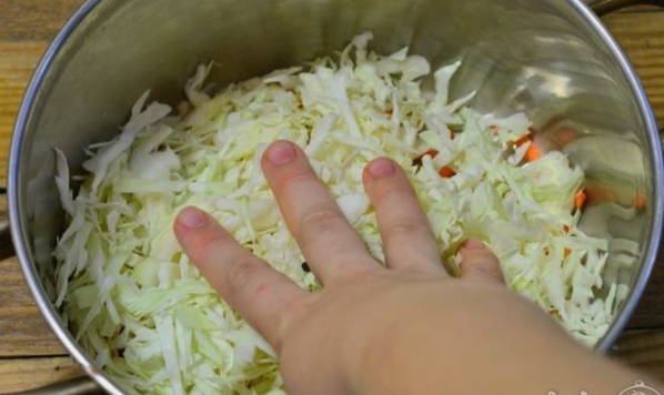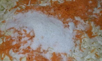 - Vul het groentemengsel met de benodigde hoeveelheid zout en suiker. We beginnen de producten te mengen. We persen de ingrediënten met kracht zodat ze het sap eruit laten.