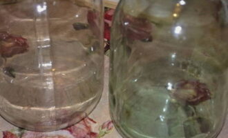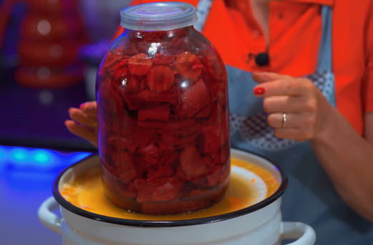 - We doen de groentemassa stevig in potten en vullen ze met warme pekel. Om het te bereiden, moet je water met zout koken en het dan een beetje afkoelen.