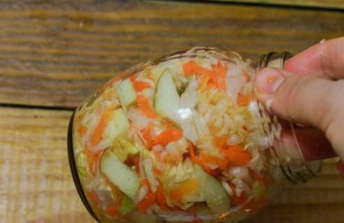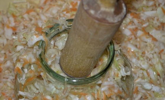 - Roer groenten met zout. Kneed de massa met je handen tot er overvloedig sap verschijnt en leg het 3-4 dagen onder druk. Wij bewaren op kamertemperatuur.