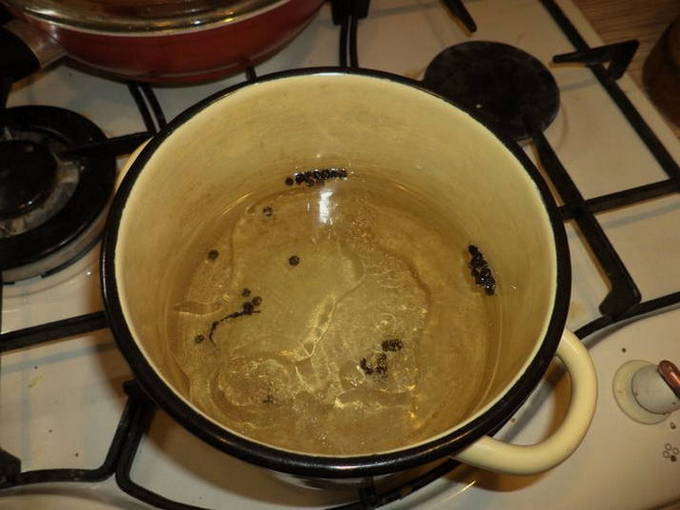 - Laten we eerst de marinade bereiden. Kook water en doe er zout, suiker en zwarte peperkorrels in. Roer en kook 1-2 minuten.