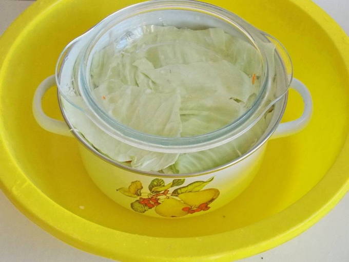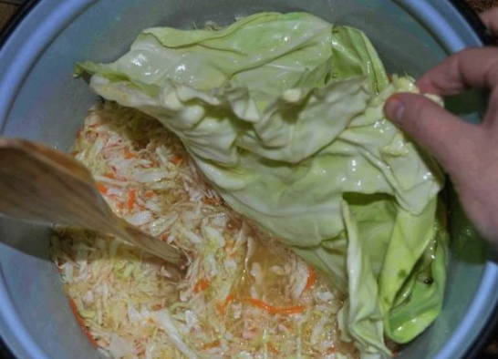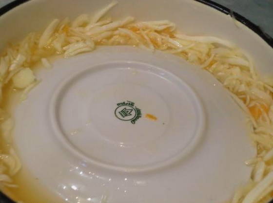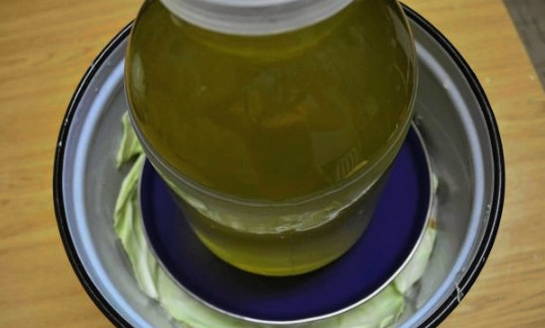 - We bedekken de massa met vloeistof met een plaat en plaatsen er een geschikt gewicht bovenop. We staan erop dat de voorbereiding ongeveer 3 dagen duurt.