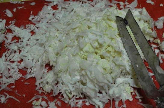 - Verwijder de bovenste bladeren van de krop van de witte kool en hak deze vervolgens fijn met een mes.