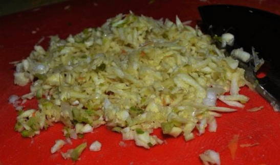 - Kneed de groentemassa met kracht totdat het sap vrijkomt.