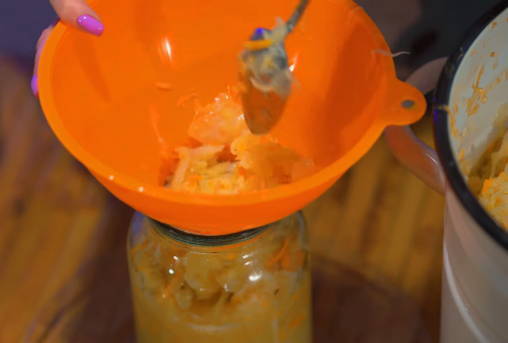 - Een paar dagen later laat u de afgewerkte kool met behulp van een trechter in schone en droge potten zakken. We bedekken ze met nylon deksels en bewaren ze op een koele plaats.