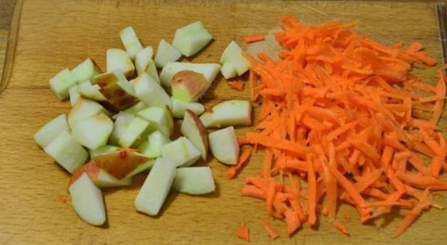 - Schil en rasp de wortelen. Spoel de appels onder water en snijd ze in kleine stukjes.
