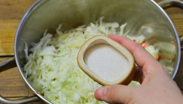 - Roer voedsel met zout en suiker. Kneed tegelijkertijd de inhoud stevig met je handen zodat het groentesap opvalt.