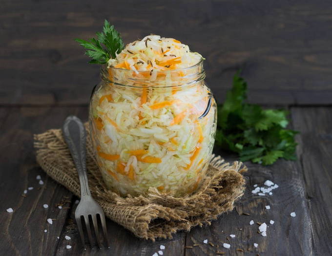 Zelfgemaakte zuurkool is een favoriete traktatie in veel gezinnen. Het kan als bijgerecht of als apart tussendoortje worden geserveerd. Voeg wortelen toe aan de bereiding om deze knapperig en helder van smaak te maken.