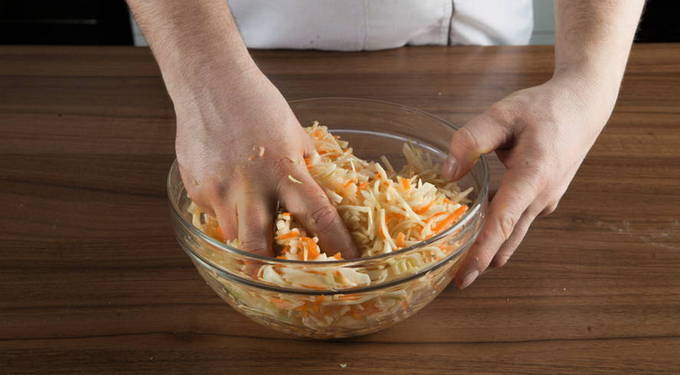 - We dompelen het product onder in een grote pan. We vullen het aan met dillezaden en geraspte wortelen. Kneed voorzichtig met je handen tot het sap vrijkomt.