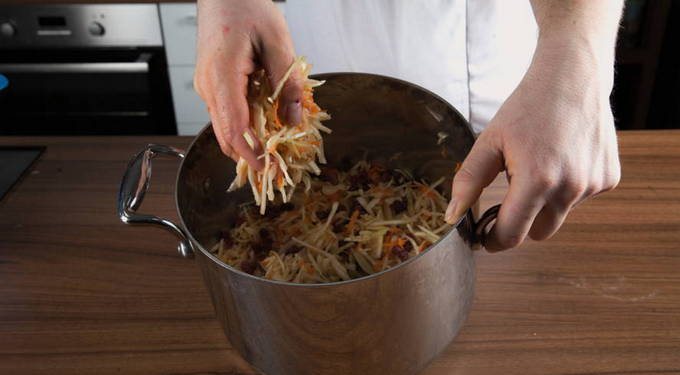 Hoe maak je sappige zuurkool met appels in potten?
