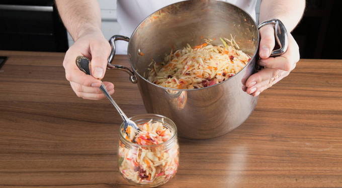 Een originele manier om kool voor de winter te fermenteren is door appels en wortelen toe te voegen. Het sappige product wordt een veelzijdige traktatie voor op je thuistafel. Let op het eenvoudige en snelle recept.