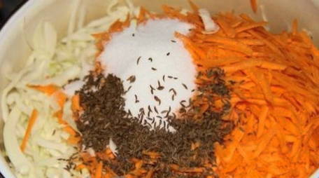 - Dompel kool met wortelen in een gemeenschappelijke kom en roer met zout, suiker, gemalen peper en dillezaden. Wrijf de massa met je handen totdat het sap vrijkomt.
