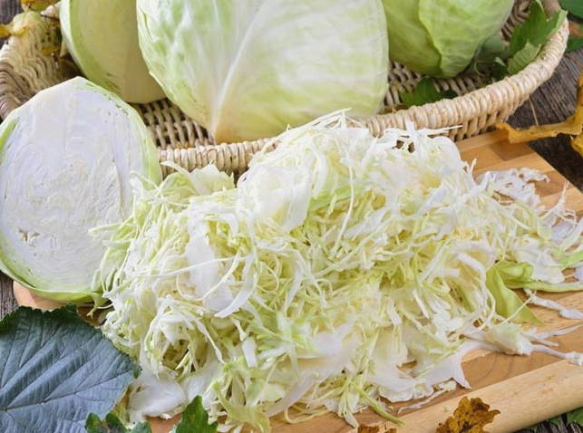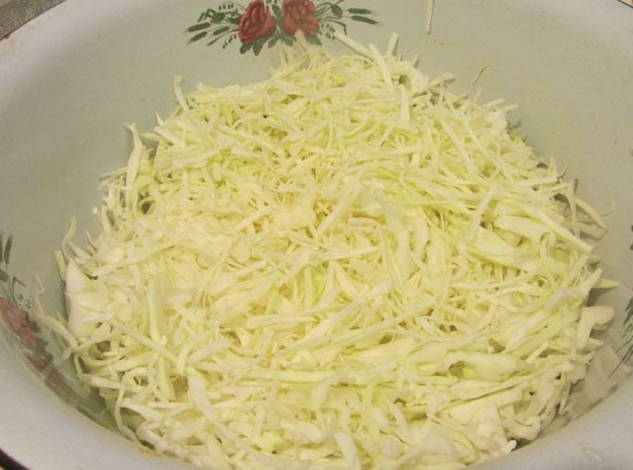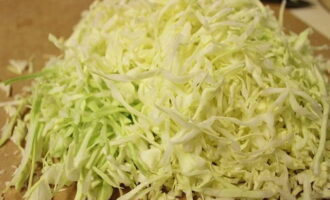- Zorg ervoor dat u de bovenste bladeren van de koolkoppen verwijdert en de stronk eruit snijdt. Daarna hakken we de voorbereide kool vrij fijn.