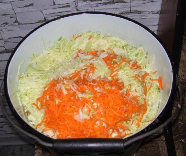 Combineer wortels met kool, zout en roer goed, maar verpletter niet veel. We verplaatsen de groenten naar een voorbereide schone emmer en stampen elke laag aan.