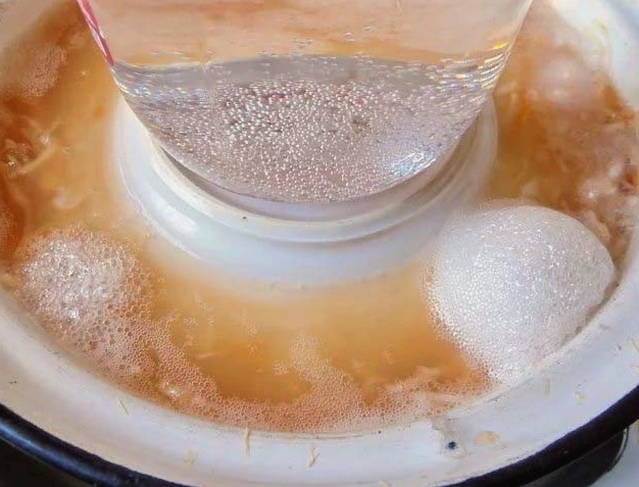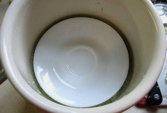- Op de bovenste laag kool strooien we ook de bladeren, een kom en een pot water. De kool zal drie dagen fermenteren en op dit moment is het belangrijk om de pers te verwijderen, deze met een scherp voorwerp te doorboren en het schuim te verwijderen.