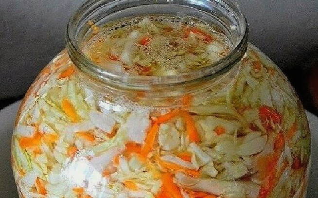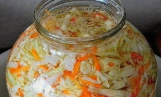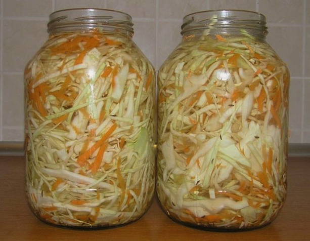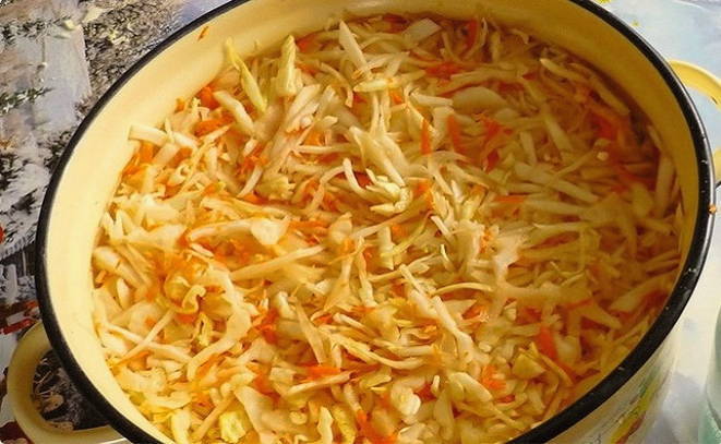 - We controleren de gereedheid van de kool gedurende 2-3 dagen. Zodra de onaangename vloeistof niet meer opvalt van de kool, doen we de zuurkool in de potten en sluiten we af met eenvoudige deksels. Zo'n blanco bewaren we op een koele plaats.