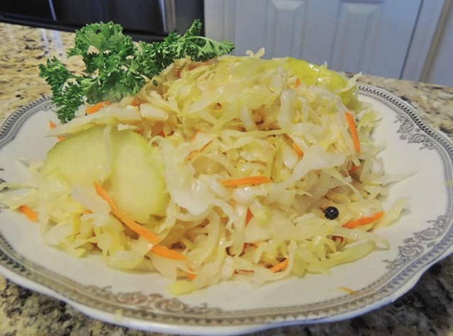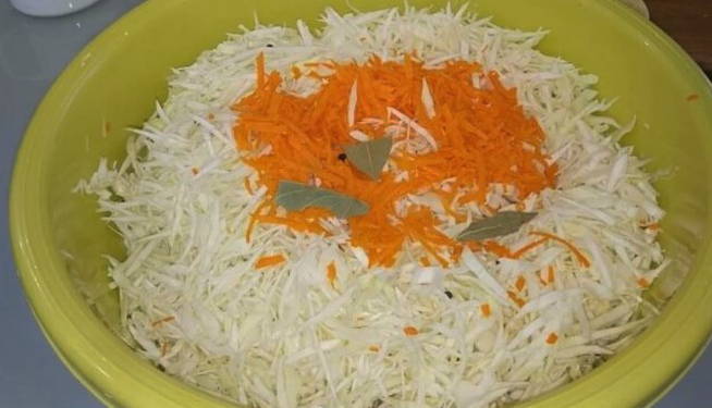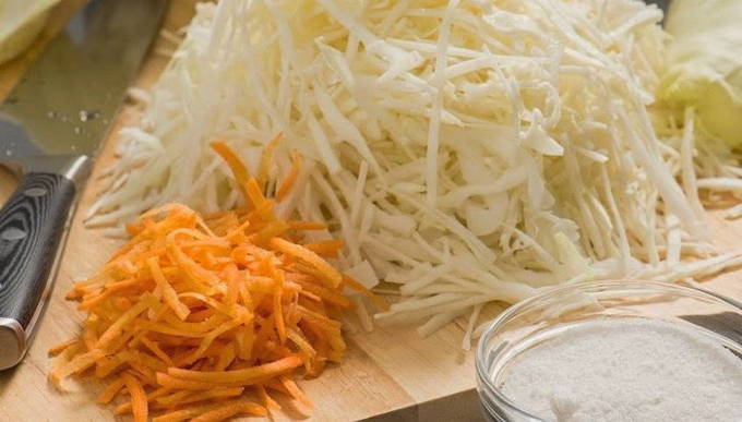 - Doe alle ingrediënten in een emmer, druk ze goed aan met een deegroller of crush. Leg bovenop de kool een bord en een pers, waardoor de groenten het sap eruit kunnen laten. Het fermentatieproces duurt maximaal drie dagen, waarbij de kool met een stokje moet worden doorboord.